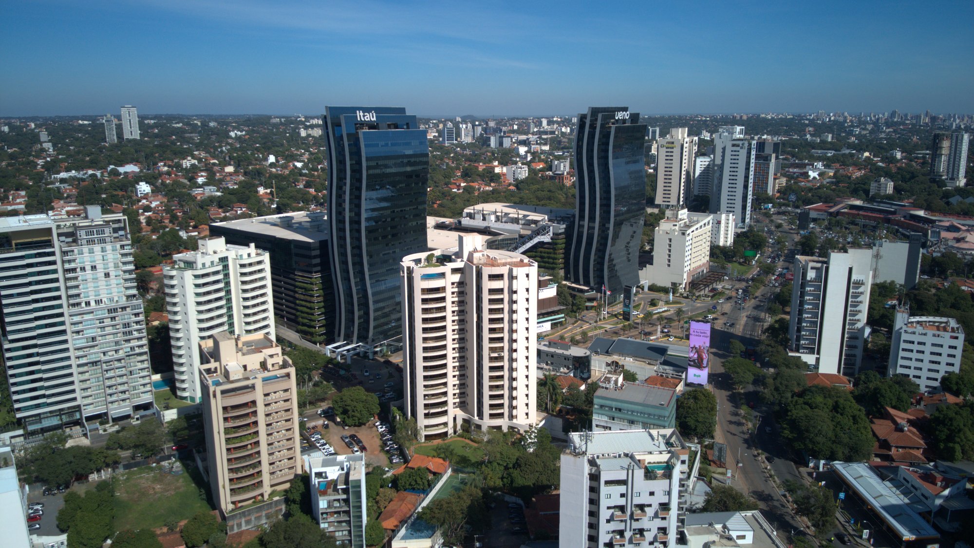 The tower sits at the intersection of Avenida Santa Teresa and Aviadores del Chaco — Asunción's prime commercial corridor. Paseo la Galeria, World Trade Center, and Shopping del Sol are all within a 5-minute walk.